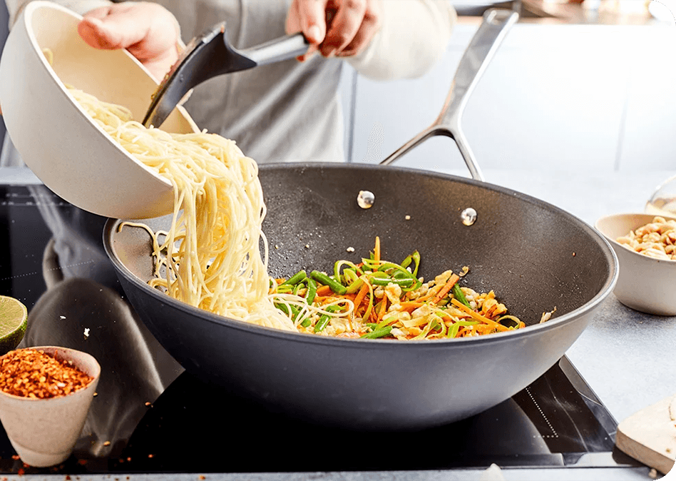 - Verhit 5 cl wokolie in een Demeyere wokpan en zorg ervoor dat de wok op de juiste temperatuur is.