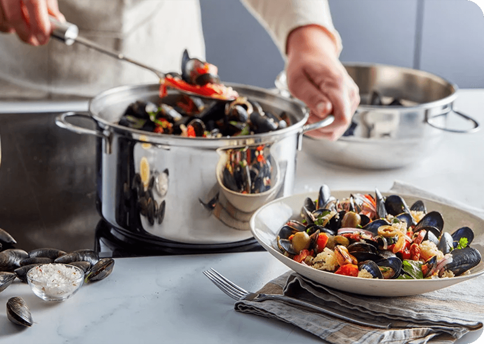 - Meng de mosselen goed met de couscous en laat de mosselpot nog enkele minuten staan met het deksel erop.