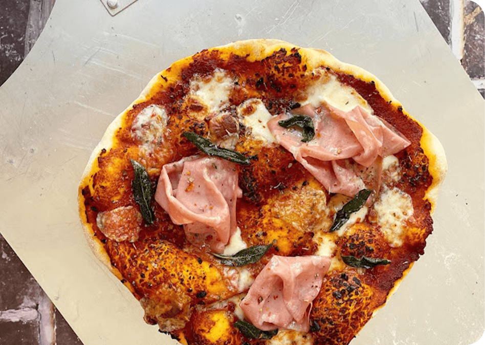 - Strooi de salieblaadjes over de pizza en snij hem in punten