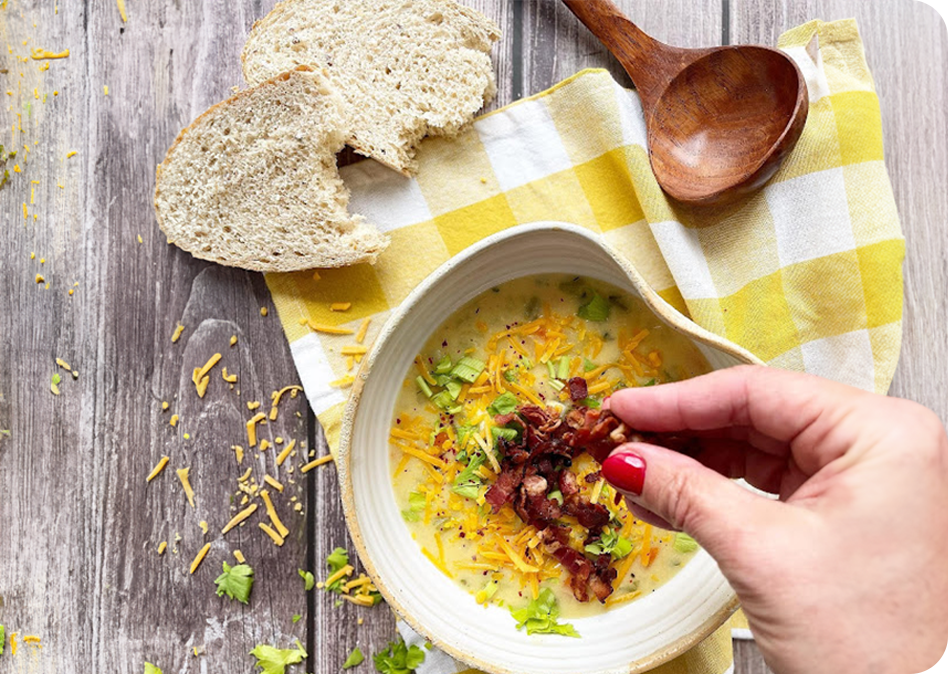 - Schep de soep in diepe kommen en werk af met extra geraspte cheddar, krokant spek en pijpajuin.