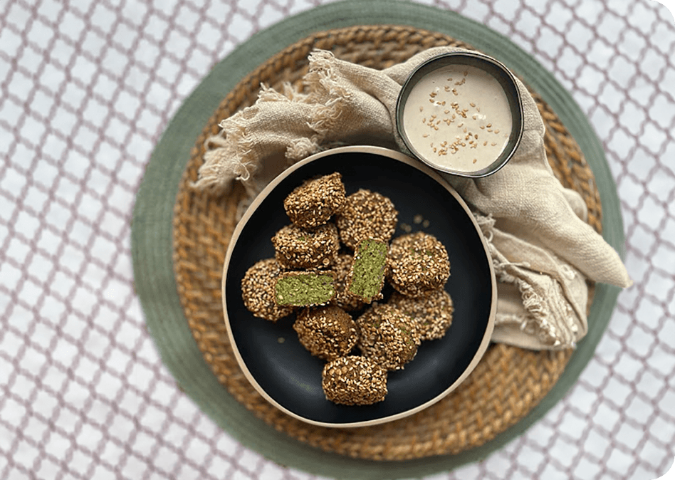 • Doop de falafel aan beide zijden in het zaadmengsel.