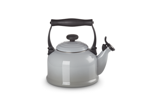 De Le Creuset Tradition fluitketel van 2,1 liter in Mist Grey brengt klassieke elegantie naar je keuken. Deze ketel combineert tijdloos design met functioneel gebruiksgemak. Hij fluit wanneer het water kookt, heeft een sterke bodem geschikt voor inductie en is voorzien van een comfortabele handgreep die koel blijft tijdens het schenken. Dankzij het geëmailleerde staal is hij duurzaam en gemakkelijk te reinigen, terwijl de Mist Grey kleur een stijlvolle touch geeft aan je fornuis.