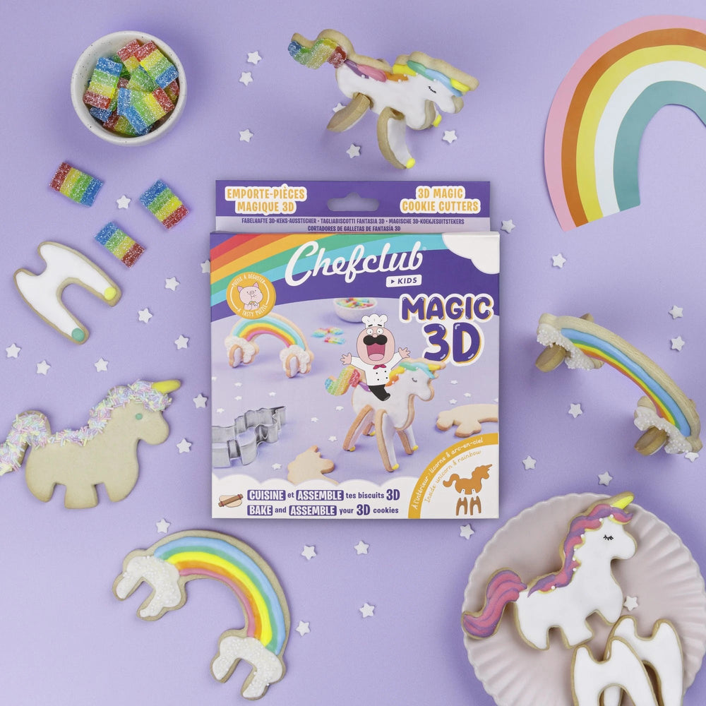 De Chefclub uitsteekvormpjes brengen plezier naar de keuken. Met deze set maak je koekjes die niet alleen lekker zijn, maar ook opgebouwd kunnen worden tot een 3D eenhoorn en regenboog. De metalen vormpjes zorgen voor strakke lijnen. Dankzij de video-instructie bak je zonder zorgen en is het resultaat telkens geslaagd.