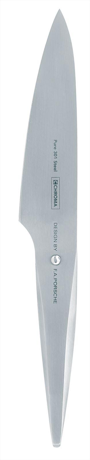 Het Chroma Type 301 klein universeel chefmes van 14,2 cm is een compact en veelzijdig mes, ontworpen door F.A. Porsche. Dit mes combineert elegantie en functionaliteit, en is perfect voor allerlei snijtaken in de keuken.