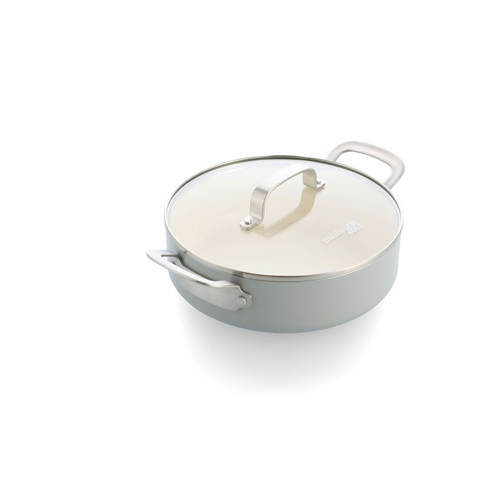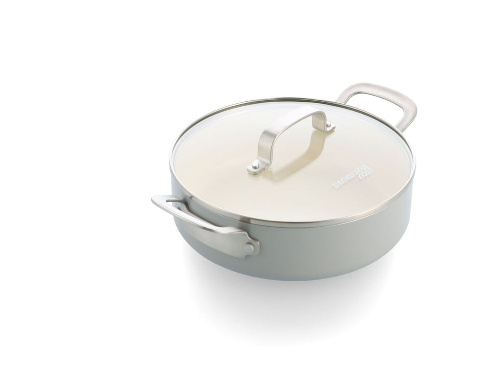 De Dagelijkse Kost Stoofpan Proline 24 cm combineert een elegant truffelgrijs design met een hoogwaardige crèmekleurige binnenkant. Dankzij het gebruik van 100% gerecycleerd aluminium biedt deze stoofpan een uitstekende warmteverdeling en een energiezuinige kookervaring. De PFAS-vrije keramische antikleeflaag maakt gezond koken en eenvoudig schoonmaken mogelijk.