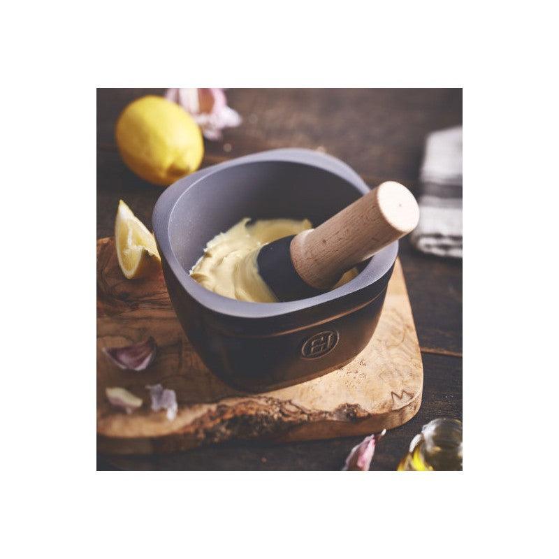 De Emile Henry Mortier Truffe is een elegant en praktisch keukenaccessoire, ideaal voor het maken van heerlijke pesto's of het fijnstampen van je bereidingen. Het binnenoppervlak van de mortier en het uiteinde van de stamper zijn ruw en niet-poreus, ontworpen om voedsel vast te grijpen dat moet worden geplet, zonder een vlek of geur achter te laten.