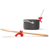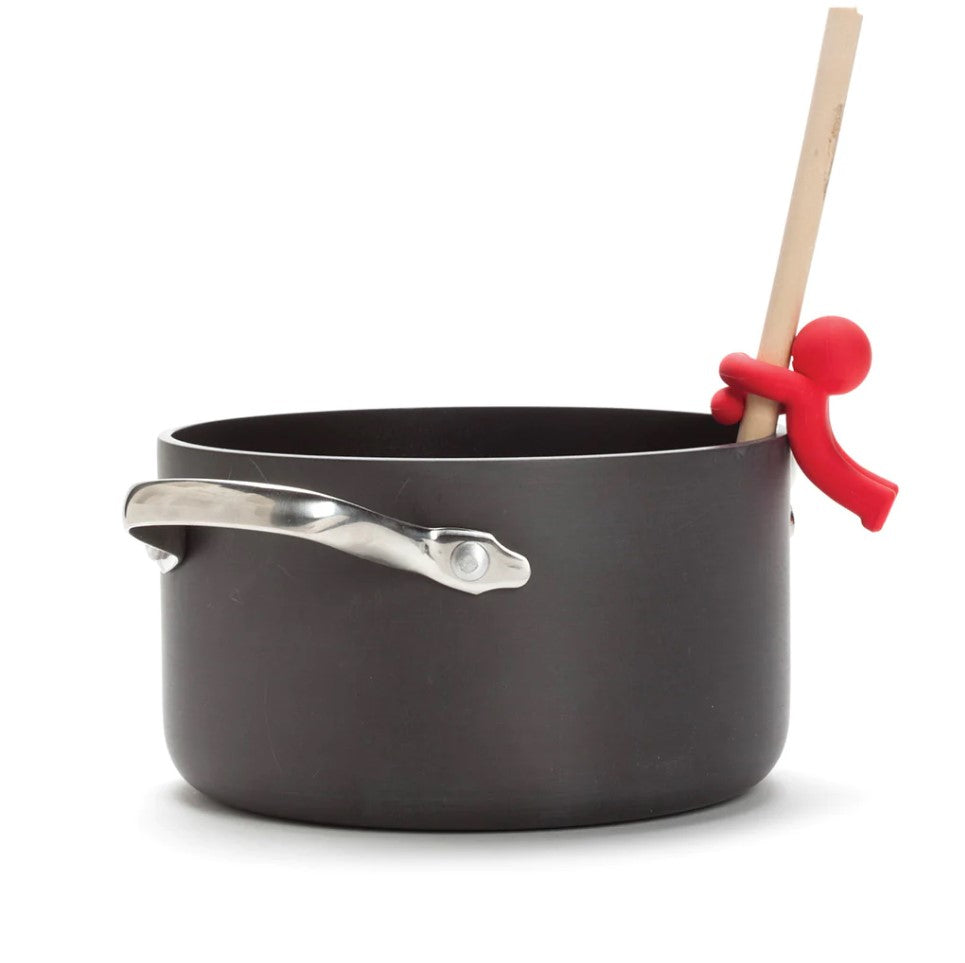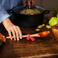 Siliconen beeldje om je kooklepel op zijn plaats te houden. Zorgt ervoor dat kookgerei niet in de soep verdwijnt. Houdt keukengerei van het werkblad wanneer het niet in gebruik is.