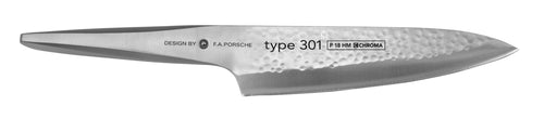 Binnen de type 301-collectie lanceert Chroma een nieuwe variant, gebaseerd op een oude ijzersmid techniek: hammered messen. Naast de speciale vormgeving is het grote voordeel van deze techniek dat ingrediënten niet langer aan je mes kleven. Door de hammered structuur komt er lucht tussen het mes en het ingrediënt met een anti-kleefeigenschap als gevolg waardoor je ingrediënten makkelijk van het mes vallen. In de unieke messencollectie van Chroma TYPE301 Design by F.A. Porsche is de greep gemaakt van 18/10 roestvrij staal en het lemmet van hoogwaardig Japans staal type 301. Dat maakt het mes bijzonder geschikt als keukengereedschap. Alle messen worden met de hand geslepen door een meesterslijper. De snede van het mes heeft de traditionele Japanse V-vorm, wat het mes uiterst scherp maakt en waardoor het ook lang scherp blijft. Een groeiende schare topkoks hebben hun liefde verklaard aan de creatie van F.A. Porsche. Onderhoud / Deze messen mogen, net als andere koksmessen, niet in de vaatwasser. Ze zijn heel hygiënisch en gemakkelijk te onderhouden omdat ze geen naden hebben. Wassen in warm water en afdrogen na gebruik volstaat.