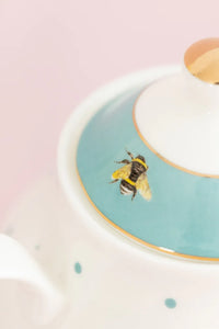 Deze theepot is niet zomaar een serviesstuk. Het combineert functionaliteit met een speelse uitstraling. De klassieke combinatie van wit porselein met turquoise en gouden details maakt het een echte blikvanger. Het woord 'GIN' in ouderwetse letters en het schattige bijtje dat op bijna elk item te vinden is, geven het een unieke charme. Dit servies is perfect voor mensen die van vintage houden en graag een grapje kunnen waarderen.