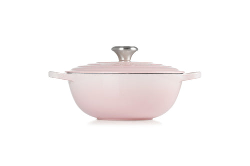 De Le Creuset gietijzeren marmite in Shell Pink, met een diameter van 24 cm en een capaciteit van 4,8 liter, is ideaal voor het bereiden van soepen, stoofschotels en andere heerlijke gerechten. Deze marmite combineert functionaliteit met een zachte roze tint, geïnspireerd door schelpjes.