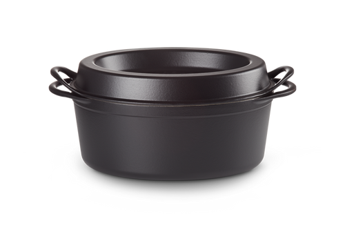 De unieke Doufeu® deksel is ontworpen met een holle bovenkant waarin je ijsblokjes kunt plaatsen. Dit bevordert de condensatie binnenin de pan, waardoor je gerechten nog malser en smaakvoller worden. Voeg een vleugje stijl en functionaliteit toe aan je keuken met de Le Creuset gietijzeren ovale Doufeu® in Mat Zwart.