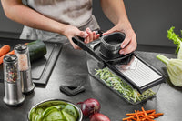 Door de stevige combinatie van RVS en kunststof is deze mandoline eenvoudig te reinigen en bestand tegen intensief gebruik. De opvangbak en het snijmechanisme zijn eenvoudig af te spoelen met water, maar voor langdurige scherpte is handwas aanbevolen.