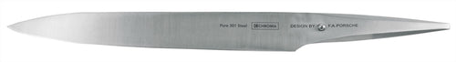Sashimimes. In de unieke messencollectie van Chroma TYPE301 Design by F.A. Porsche is de greep gemaakt van 18/10 roestvrij staal en het lemmet van hoogwaardig Japans staal type 301. Dat maakt het mes bijzonder geschikt als keukengereedschap. Alle messen worden met de hand geslepen door een meesterslijper. De snede van het mes heeft de traditionele Japanse V-vorm, wat het mes uiterst scherp maakt en waardoor het ook lang scherp blijft. Een groeiende schare topkoks hebben hun liefde verklaard aan de creatie van F.A. Porsche. Onderhoud / Deze messen mogen, net als andere koksmessen, niet in de vaatwasser. Ze zijn heel hygiënisch en gemakkelijk te onderhouden doordat ze naadloos zijn. Wassen in warm water en afdrogen na gebruik volstaat.