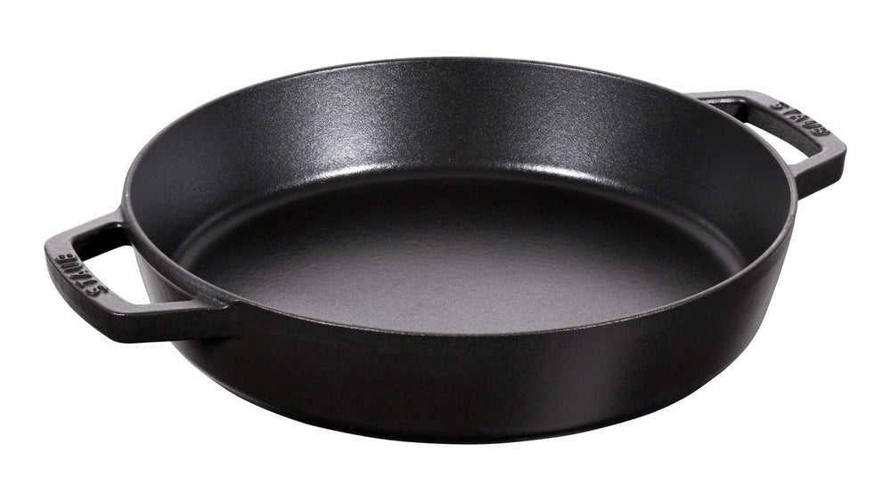 De Staub Paellapan is ontworpen met een geëmailleerd gietijzeren kern voor optimale warmtebehoud. Het heeft een stijlvolle beukenhouten steel die koel blijft tijdens het bakken. De pan zelf is afgewerkt met een matzwarte, licht getextureerde emaillaag, waardoor uw ingrediënten mooier bruinen.