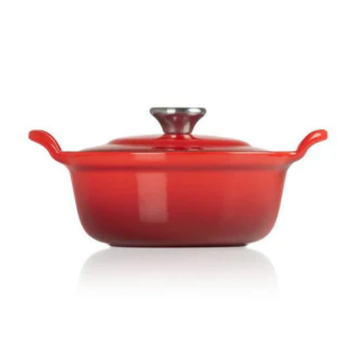 De Le Creuset gietijzeren ronde braadpan met plaatstalen deksel in Kersenrood, met een diameter van 32 cm en een capaciteit van 7,8 liter, is ideaal voor het bereiden van stoofschotels, braadstukken en soepen. Deze pan combineert de uitstekende warmteverdeling van gietijzer met de duurzaamheid van een plaatstalen deksel.