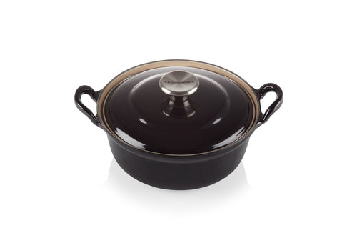 De Le Creuset gietijzeren ronde braadpan met plaatstalen deksel in Ebbenzwart, met een diameter van 32 cm en een capaciteit van 7,8 liter, is ideaal voor het bereiden van stoofschotels, braadstukken en soepen. Deze pan combineert de uitstekende warmteverdeling van gietijzer met de duurzaamheid van een plaatstalen deksel.