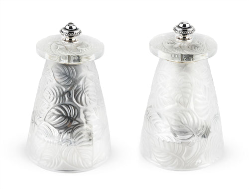 Het duo peper- en zoutmolen Lalique, gepresenteerd in een mooie verpakking, is een heruitgave van de molen “Feuilles” gecreëerd in 1924 door René Lalique, in samenwerking met Peugeot.