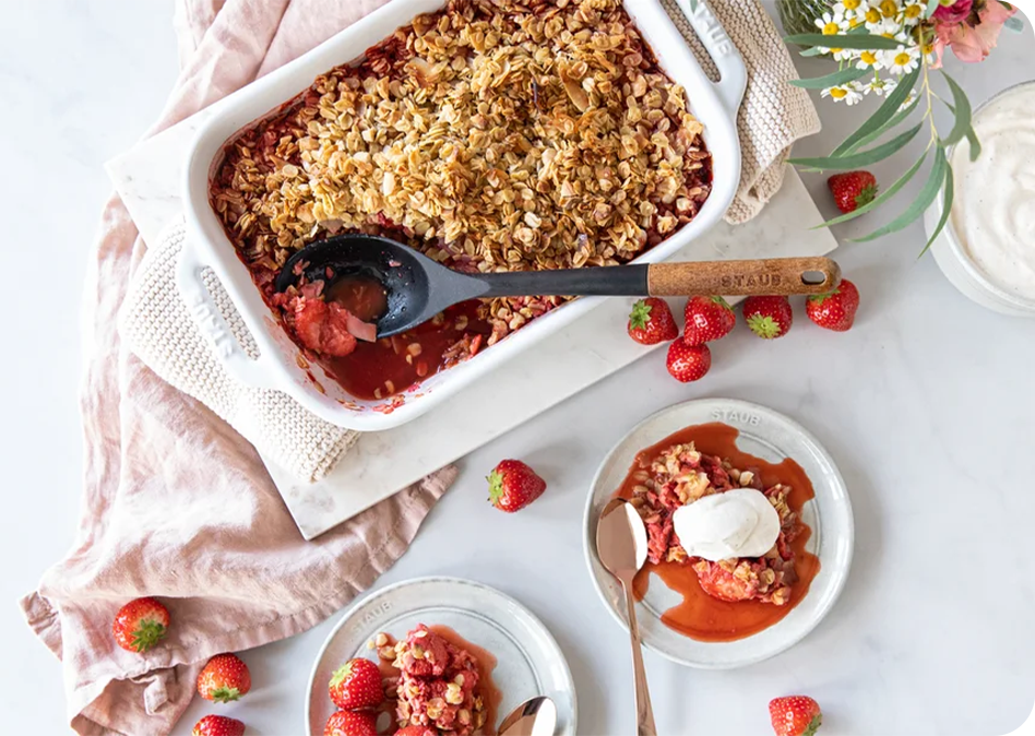 - Doe het aardbeienmengsel in een ovenschotel en spreid de granola erover