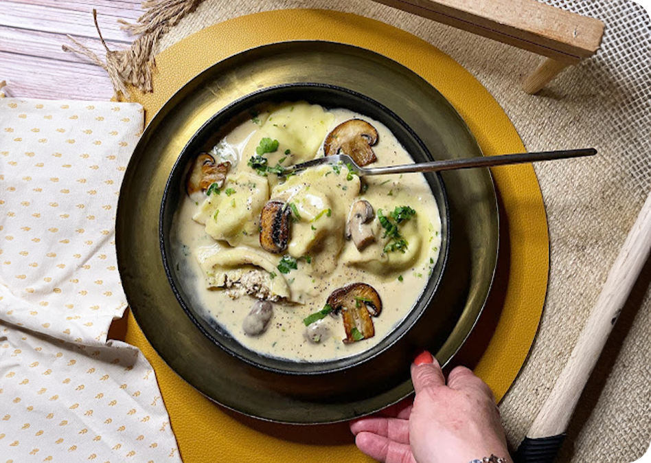 - Serveer ravioli met de saus en werk af met peterselie en peper.