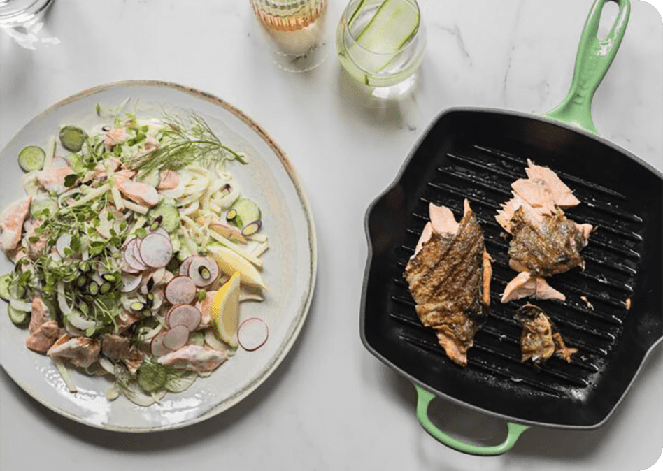Gebakken regenboogforel met kappertjesbessen en verfrissende komkommer-appelsla
