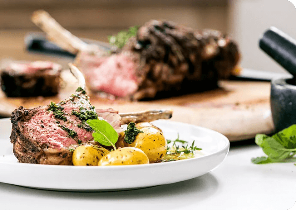 - Serveer het geroosterde lamsvlees met de kruidige aardappelen en besprenkel het vlees met de verfrissende muntsaus.