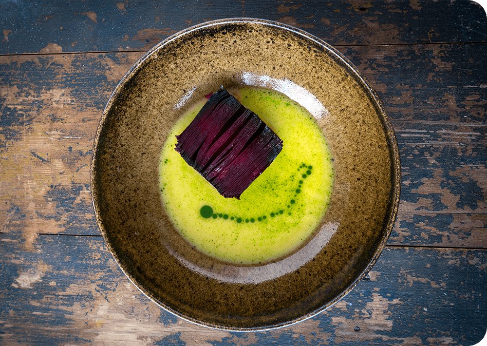 Notities: Dit gerecht combineert de zachte textuur van de bietenmillefeuille met de rijke smaken van de Tomasu beurre blanc en de frisse toets van peterselieolie, een verfijnde combinatie voor een gastronomisch vegetarisch gerecht.