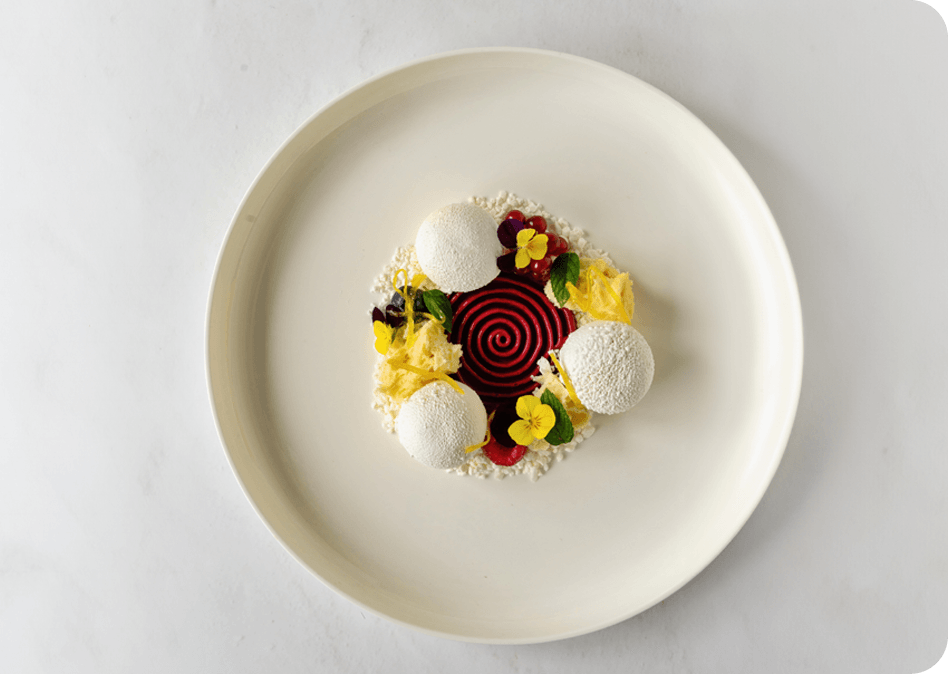 - Schik op borden met meringue crumble, rood fruit, munt, viooltjes en citroenzestes.
