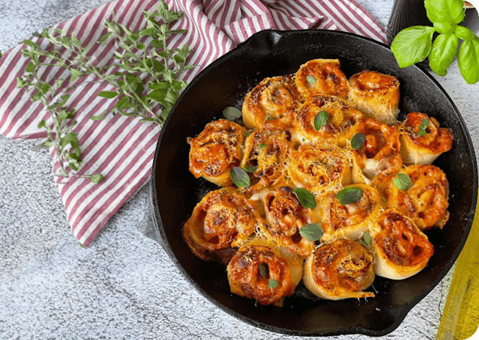 - Haal de pizzarolletjes uit de oven en strooi er verse oreganoblaadjes over voor extra smaak.