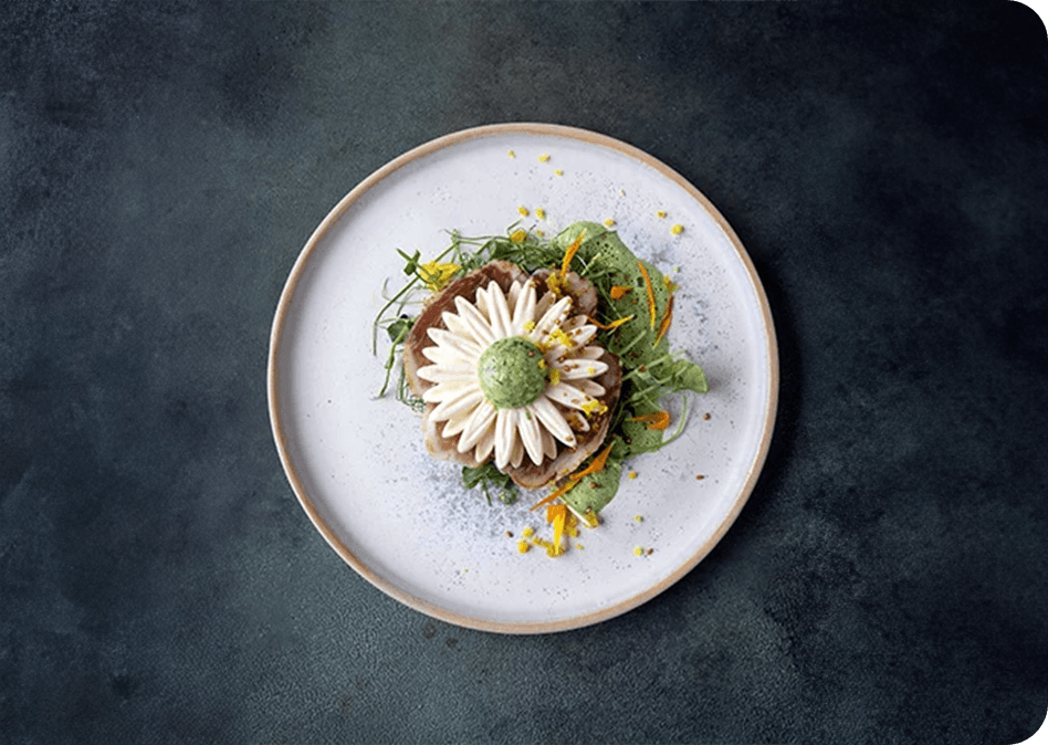 Asperge panna cotta met daslook pesto, -saus en bellota ham
