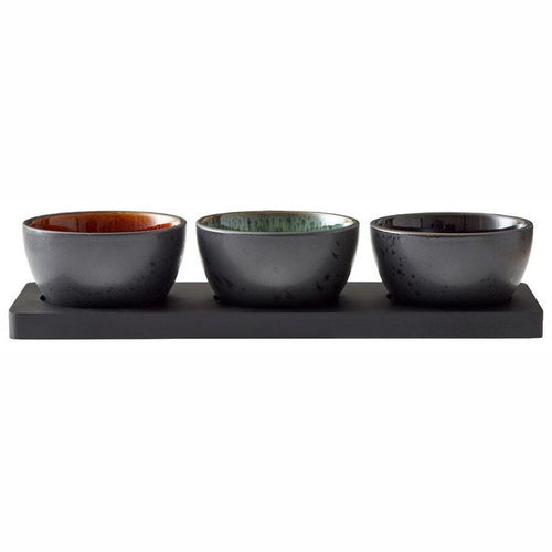 Deze set serveerschalen komt van het merk Bitz. Deze tray met schalen bevatten een matte kleur met een glanzend effect aan de binnenkant, dankzij het reactieve glazuur. Dit samen met het aardewerk materiaal zorgt ervoor dat elke schaal een uniek en chique uiterlijk heeft, wat helemaal past bij de ruwe en unieke look waar het merk Bitz voor gaat. De schalen hebben aan de binnenkant elk een andere chique kleur. Ze zijn magnetron en oven bestendig tot 220 graden. Zorg er wel voor dat de schalen samen met de oven verwarmt worden, omdat de shock van het temperatuurverschil ervoor kan zorgen dat ze kunnen barsten. Na gebruik mogen de schalen in de vaatwasser, de houten tray kan met een vochtig doekje afgedaan worden.