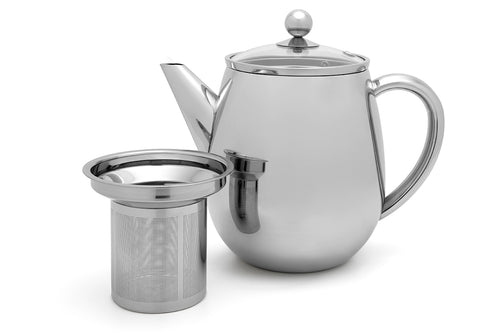 Geniet van perfect gezette thee met de Bredemeijer Duet Eva Theepot 1,1l in glanzend zilverkleurig roestvrij staal!