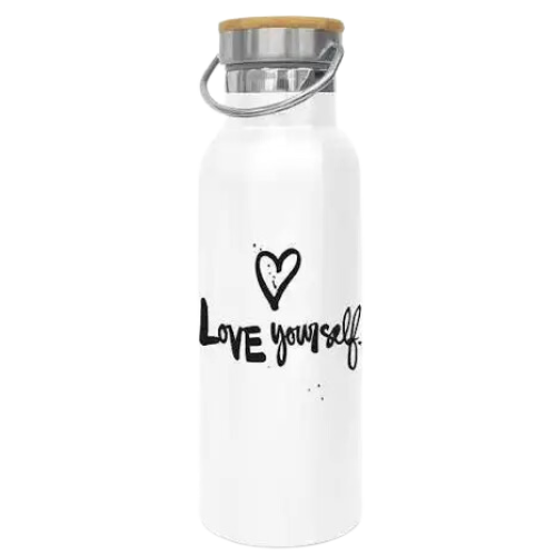 Roestvrijstalen thermoskan met een interessant opschrift Love yourself. De thermoskan is dubbelwandig en houdt de warmte tot wel 12 uur vast, terwijl koude dranken dat tot wel 24 uur blijven. Het nauwsluitende deksel houdt uw drankje 100% veilig tegen onbedoeld morsen. De inhoud van de thermoskan is 0,5 ml, terwijl de afmetingen zijn: hoogte 22,5 cm en de inhoud van de fles is 7,1 cm.