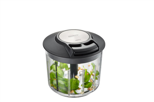 Met de Gefu Hakmolen kunt u eenvoudig groentes mixen, snijden of pureren. Dit doet u door middel van een handig touwmechanisme. De twee zeer scherpe geboge messen zorgen voor een optimaal resultaat. De snijder is gemaakt van kunststof. De twee snij- elementen zijn gemaakt van Japans lemmetstaal en hebben twee gevormde snijvlakken. De capaciteit van de transparante reservoir is 1000 ml. Door de trekmechanisme heeft u geen stroom nodig en kunt u de Gefu multisnijder overal mee naar toe nemen.