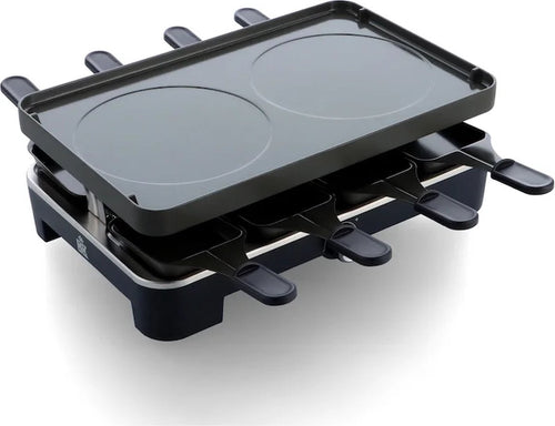 De BK Connect Gourmet Raclette is een veelzijdige en praktische racletteset voor gezellige etentjes. Deze raclette is geschikt voor maar liefst acht personen en combineert gebruiksgemak met slimme functies. Dankzij de antikleeflaag en de uitneembare platen is schoonmaken eenvoudig. De geribbelde plaat aan de ene kant en de pannenkoekenplaat aan de andere zorgen voor variatie tijdens het koken. Met een vermogen van 1200 watt en een instelbare temperatuur bereid je moeiteloos diverse gerechten aan tafel.