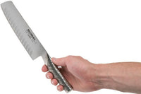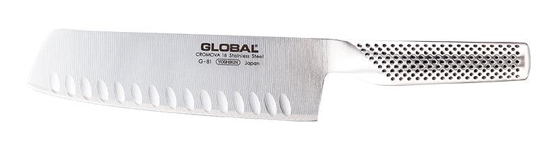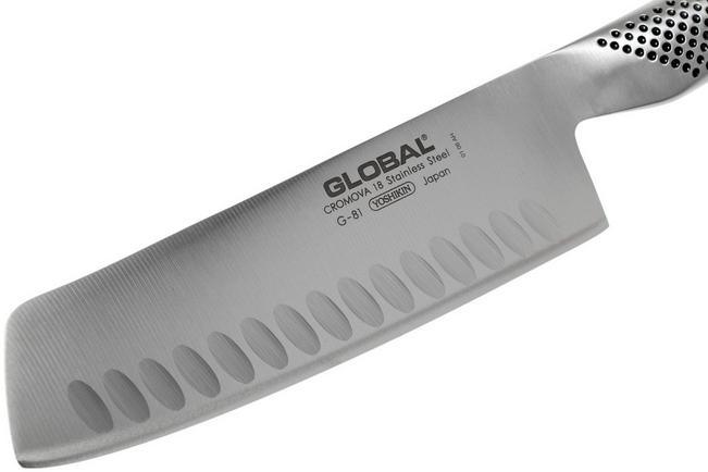 Het Global G81 Groente/hakmes kuiltjes 18cm is een onmisbaar gereedschap in elke keuken. Het mes maakt het perfect voor een breed scala aan snijtaken, van groenten tot vlees. De kuiltjes zorgen ervoor dat voedsel minder snel aan het lemmet blijft plakken.