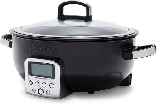 De GreenPan Omni Cooker in de kleur black past moeiteloos in elke moderne keuken. De aluminium behuizing is stevig en duurzaam, terwijl de bediening via knoppen met display intuïtief werkt. De PFAS-vrije coating en BPA-vrije materialen maken hem een bewuste keuze voor dagelijks gebruik. Ook handig: de verwijderbare binnenpan is vaatwasserbestendig.