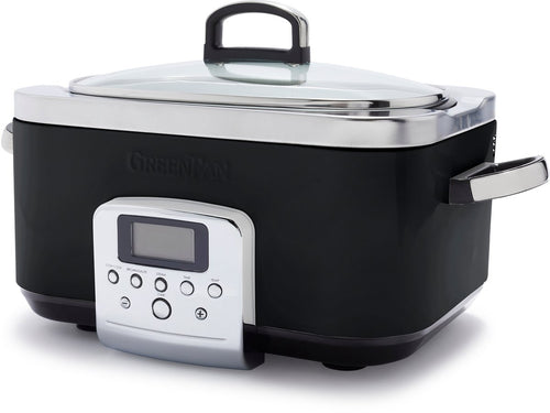 De GreenPan slow cooker Black is een multifunctionele elektrische sudderpan met een strak zwart design. Dankzij de keramische antikleeflaag en het ruime inhoudsformaat van 6 liter bereid je eenvoudig smaakvolle stoofgerechten, soepen en zelfs complete maaltijden. De pan is voorzien van 8 automatische programma’s, een warmhoudfunctie en handige extra’s zoals een verwijderbare kom en vaatwasserbestendige onderdelen. Zo geniet je moeiteloos van langzaam gegaarde gerechten met behoud van smaak en textuur.