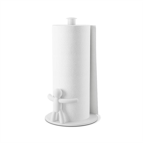 Buddy ziet er niet alleen opvallend uit, maar is ook heel praktisch; de gegoten figuur zorgt voor wrijving en hefboomwerking, zodat je met één hand een vel kunt afscheuren zonder de hele rol af te wikkelen. De houder neemt maar weinig ruimte in op je aanrecht en het schoonhouden gaat zonder problemen en snel.