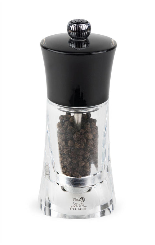 De Peugeot pepermolen Molène zwart speelt met het contrast tussen zijn transparante body en zijn ondoorzichtige zwarte kop. De body van deze acryl pepermolen is gedraaid om het effect van beweging en licht te creëren. Deze molen is uitgerust met het Peugeot maalwerk voor peper, met onbeperkte garantie. Met zijn instelknop kunt u de maalgraad van de peper instellen: hoe sterker de knop is aangedraaid, hoe fijner de peper. Hij zal perfect passen bij alle vitaminekleurige zoutmolens in de collectie.