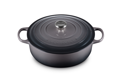 De Le Creuset Lage Braad-/Stoofpan Signature Rond 30cm 6,2L in de kleur Flint is ideaal voor het bereiden van stoofschotels, braadstukken en eenpansgerechten. Dankzij het hoogwaardige gietijzer wordt warmte gelijkmatig verdeeld en langdurig vastgehouden, wat zorgt voor een optimaal gaarresultaat. De lage wanden maken de pan perfect voor recepten die een breed kookoppervlak nodig hebben, zoals risotto, paella en gegrilde groenten.