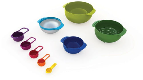 Deze 9-delige set van Joseph Joseph bestaat uit 2 mengkommen, een zeef, een vergiet en 5 maatlepels. De hele set is handig stapelbaar, bijzonder kleurrijk en bovenal erg praktisch. Al deze producten uit deze set zijn vaatwas bestendig.