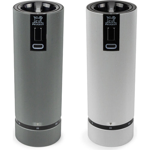 De Peugeot LINE U'SELECT elektrische peper- en zoutmolen set uit de Line serie is een stijlvolle en functionele toevoeging aan elke keuken. Deze hoogwaardige molens, gemaakt van geribbeld aluminium, combineren een elegant design met gebruiksgemak. De zoutmolen heeft een aluminiumkleur, terwijl de pepermolen een donkerdere carbonkleur heeft. Hierdoor houd je ze gemakkelijk uit elkaar en gebruik je ze als perfecte smaakmakers voor elk gerecht. Dankzij de 6 instelbare maalstanden kies je eenvoudig de juiste maalgraad met de u'Select functie aan de onderzijde. De molens werken op een krachtige lithium-ionbatterij die snel oplaadt en lang meegaat.