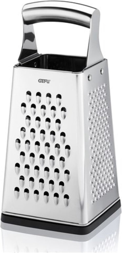 De Gefu vierkantrasp Grato is een praktische en veelzijdige rasp voor dagelijks gebruik in de keuken. Dankzij de stevige blokvorm en antislipbodem blijft de rasp stabiel staan tijdens het raspen. Met vier zijden voor verschillende rasptypes is dit hulpmiddel perfect voor kaas, groenten, chocolade en meer. Het strakke zilveren design van roestvrijstaal zorgt bovendien voor duurzaamheid en een moderne uitstraling.