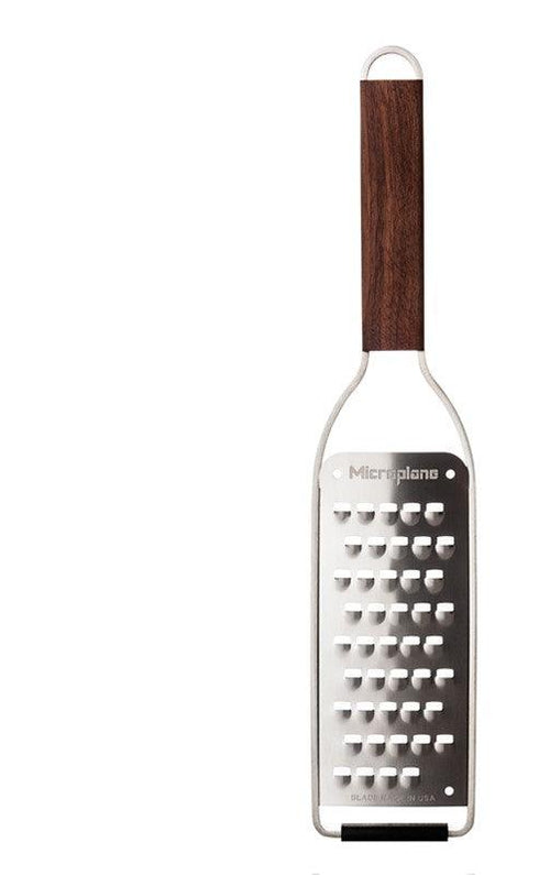 De Microplane Gourmet Rasp extra grof is een uniek stuk keukengerei. De raspen van Microplane zijn de enige raspen welke lasergesneden zijn. Dit onderscheid de raspen van vele andere merken en heeft dan ook een positief effect op de levensduur van de raspen. Het blad is gemaakt van 18/10 RVS en is met een extra verstevigde RVS behuizing bevestigd aan het handvat. Het handvat is gemaakt van een massief stuk Amerikaans notenhout en zonder schroeven bevestigd aan het staal van de rasp.