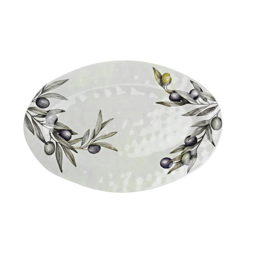 De Rose & Tulipani Olyvia ovale schotel (45 x 30 cm) brengt met zijn handgeschilderd olijvendecor de sfeer van de Middellandse Zee naar je tafel. Deze royale serveerschaal is gemaakt van stevig melamine en perfect voor het presenteren van salades, tapas, gegrilde groenten of desserts. Het frisse, groenblijvende design met olijfbladeren en -vruchten maakt deze schotel ideaal voor zowel binnen als buiten tafelen, van tuinfeest tot familie-etentje.