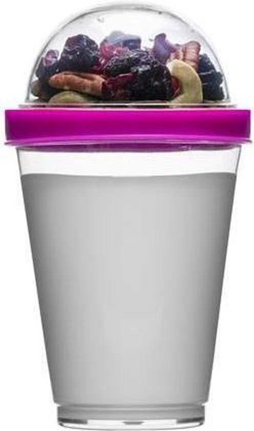 Met deze handige meeneem beker Fresh van Sagaform houd je je yoghurt gescheiden van je cruesli! Schenk de yoghurt in de beker en in de dop kun je je cruesli of bijvoorbeeld fruit kwijt. Wanneer je het op gaat eten mix je het door elkaar en zo heb je altijd een heerlijk frisse lunch. Afmeting: 15 x 9 cm Materiaal: kunststof Inhoud: 30 cl