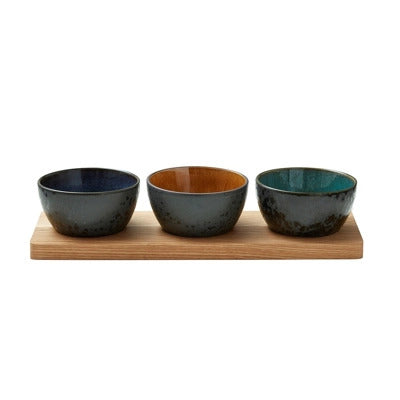 4- delige serveerset bestaand uit één eikenhoute plank en 3 schaaltjes vervaardigd uit zwart keramiek en een amber, donkerblauw en groen hand geglazuurde binnenkant, Reactive glazed