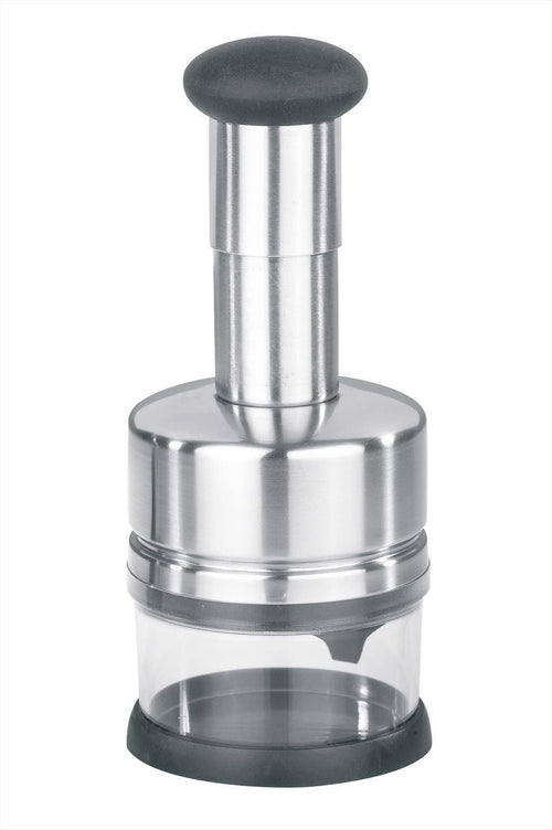De Gefu Tritare groente- en kruidenhakker is een essentieel keukengereedschap met een strak, zilveren ontwerp. Het is gemaakt van hoogwaardig roestvrij staal (RVS), wat zorgt voor duurzaamheid en een lange levensduur.