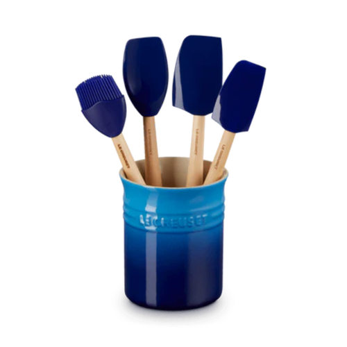 De Le Creuset Premium spatelpot met spatelset van 4 in Azure biedt een complete en stijlvolle oplossing voor al je bak- en kookbehoeften. Deze set bestaat uit vier verschillende spatels en een handige spatelpot om ze in op te bergen.