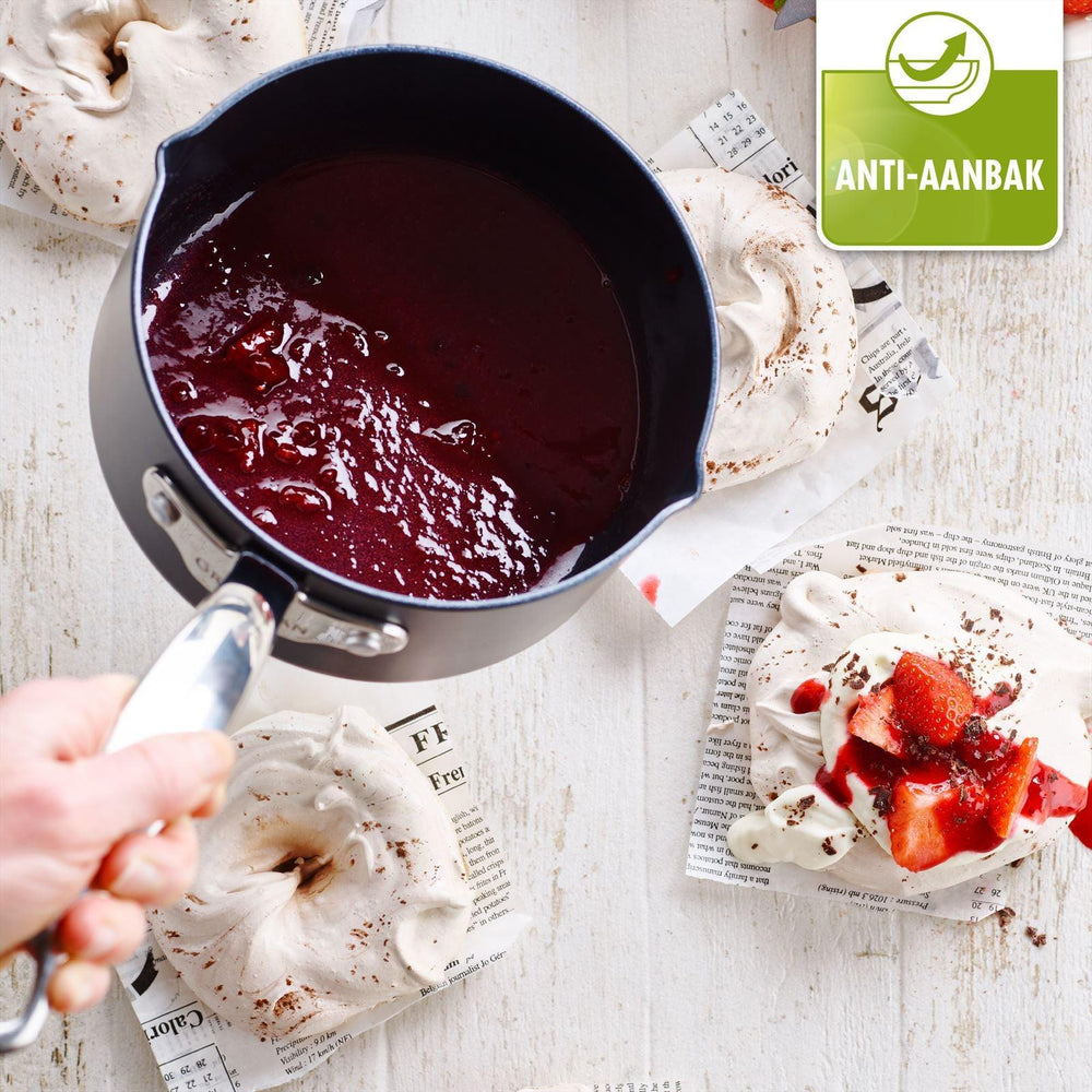 Deze steelpan is niet alleen functioneel maar ook stijlvol. De combinatie van hard geanodiseerd aluminium en een roestvrijstalen handvat zorgt voor een elegante uitstraling. Dankzij de veelzijdige constructie is de pan geschikt voor alle fornuistypen, van gas tot inductie.